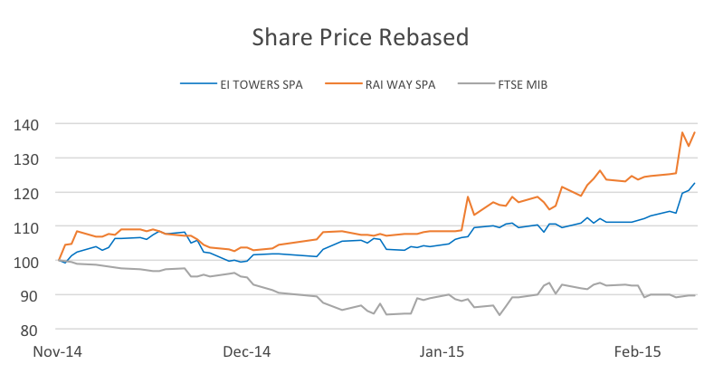 2015, February the 25th, EI Towers announced its bid for RWay, 4.5€ per share valuing the company 1.225 billions euros (market cap at the time of bid announcement was 1B€). The bid came in a very complicated political scenario; other than that, the restriction imposed by the September dated decree on RWay privatization is still in place and, given the terms of the bid (at least a 66.67% stake), it forced the Italian Government to reject the bid on February the 27th, two days later. The same day, Citi published a report on the (media) tower sector in Italy, explaining that a consolidation would be extremely profitable and would generate more cash in a context where investments are capital intensive and the leverage already at high levels. In the same report, Citi increased the target price both for EI Towers and RWay at 55€ and 4.5€ per share respectively, rating buy, due to evident synergies that would benefit EI Towers. For institutional investors, RWay is considered as being a bond (cash cow status) with interesting M&A opportunities.