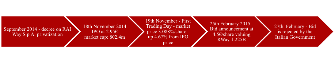 In September 2014, the Italian Government issued a decree regarding the privatization of the state owned company RAI Way S.p.A. (from now on, RWay). The decree came after the decision to list the company; indeed, due to the delicate role the tower sector plays in the country, the Government fixed some legal restrictions aimed at granting the company to serve the public interest even after the privatization process. One of these restrictions was that no more than 49% of RWay would have been sold by the Minister of Economic and Finance (the legal shareholder).