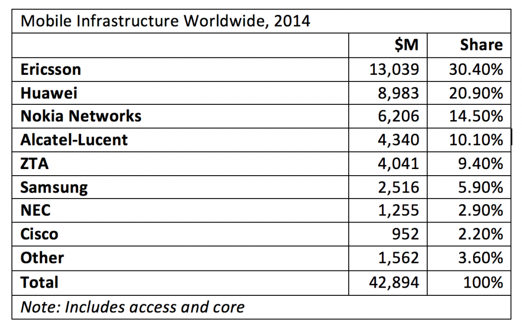 On April 15, 2015 Nokia announced a €15.6bn offer for Alcatel-Lucent that will create a huge Finnish-French rival to Ericsson and Huawei in the telecoms equipment industry, with a market capitalization of about €40bn and sales of about €27bn, matching those of Ericsson.