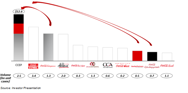 The new combined company – CCEP – is expected to become the largest independent Coca-Cola bottler based on net revenues. Pro forma net revenues and EBITDA in 2015 are expected to be around $12.6bn and $2.1bn, respectively, with a volume of 2.5bn unit cases.