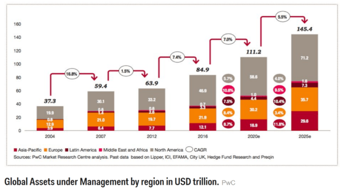 A recent study out of PwC has found that financial institutions, asset managers in particular, are experiencing a slew of changes in the coming years. Consensus, too, predicts that total AuM will increase significantly in the SAAAME area (South America, Africa and Middle East) area. Furthermore, PwC states that this growth can be attributed to three factors: i) increased incentives to take part in individual retirement plans; ii) the heightening number of ultra high net-worth clients in developing economies; and iii) new initiatives by sovereign wealth funds to outsource their discretionary management asset pools. As of 2016, the PwC report estimates the global AuM to amount to around USD 84.9tn in 2016, growing at a CAGR of 6.16% to USD 145.4tn in 2025.