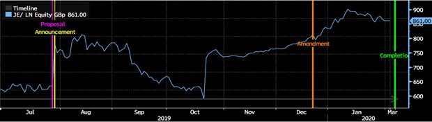 Below is a visual representation[5] of the evolution of Just Eat’s share price at the different stages of the deal. At the end of July 2019, when both parties reached a first agreement, Just Eat’s share price bounced by around 16%. More than 6 months later, Just Eat traded one last time under the ticker JE to close at £861 per share, a 26% increase to pre-acquisition stock price.