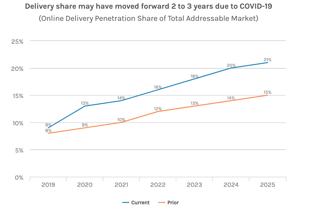 The Covid-19 pandemic along with social distancing measures have strongly impacted customer behaviour, creating structural changes to the Food and Beverage industry that could last for a long time. For instance, Working-from-home policies may enhance online food delivery service consumption, impacting how, when and how often customers spend on restaurant food. Working-from-home policy has grown to approximately 50% during the crisis vs. 15% before, according to the U.S. Bureau of Labor Statistics. According to Morgan Stanley estimates, approximately three years of customer spend is being pulled forward due to Covid-19, led by accelerated growth from delivery platforms.