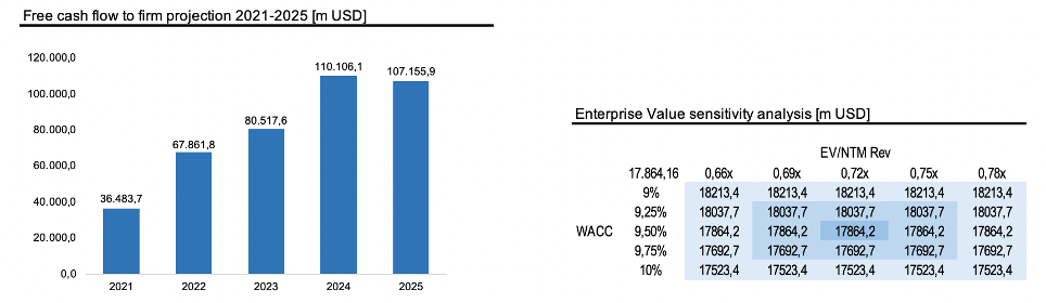 To get a view that is not affected by the mood of the market, we also deployed a DCF valuation while applying a WACC of 9.50% and an exit multiple (EV/NTM Sales) 0.72x. From a conservative DCF analysis, we retrieved an enterprise value (EV) of about $17.864 billion and an implied share price of ¥4’518.09.