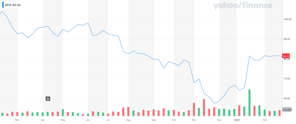 The graph above shows the price of Activision Blizzard from February 2021 to February 2022. It’s important to note that Microsoft announced the acquisition at one of Activision’s lowest prices. As everyone can expect, after the announcement the price was raised again because of the possible synergies Activision could have derived from the acquisition.