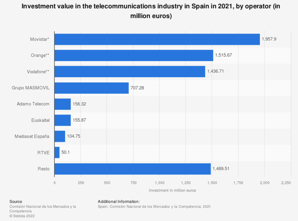 Historically, Telefonica, the former state monopoly, had dominated the Spanish market with a prominent infrastructure and commercial position. Currently, the market is shared between an oligopoly constituted by four companies: Telefonica, Orange, Vodafone, and MásMóvil, which own respectively 28.24%, 22.91%, 22.26%, and 20.55% of the market shares.