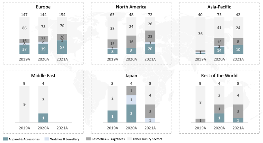Considering the geographical luxury market split, most transactions have annually taken place in Europe. In 2021, 154 transactions were registered in Europe compared to 72 transactions in North America. North America showed the highest increase in transactions, registering an increase of 24 deals (Graph 2). Both in Europe and North America, the highest growing subsector is the apparel and accessories sector, demonstrating the growing interest in the subsector and the ongoing consolidation activities.