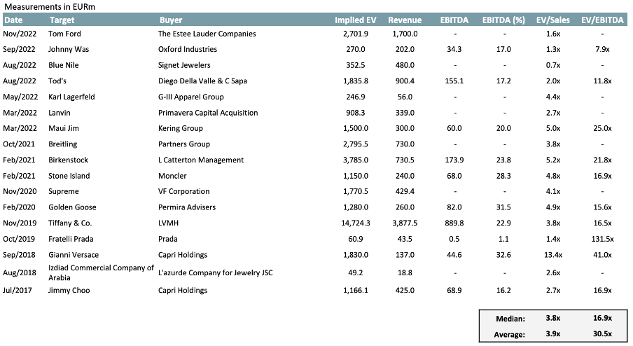 A similar analysis is conducted based on publicly listed fashion brands. As one could expect, higher multiples are observed in the CTA than the CCA. The median LTM EV/Sales and LTM EV/EBITDA multiples observed in among publicly traded companies are 2.4x and 9.9x, respectively.