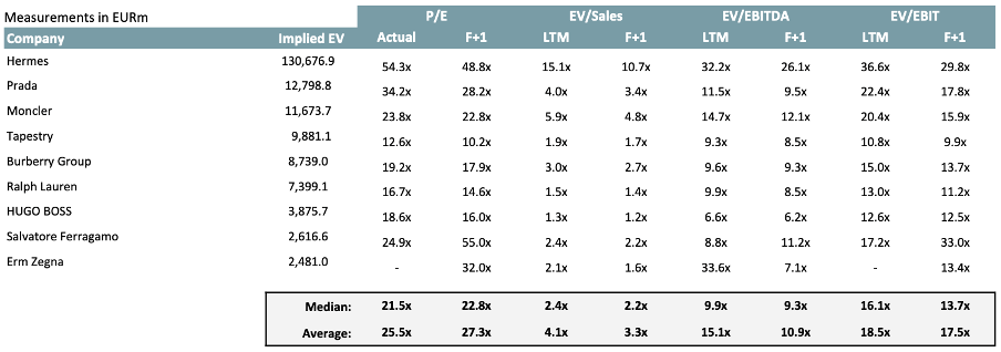 To get a more granular understanding of the value of luxury fashion brands, publicly listed fashion brands are analysed, as well as transactions in the space. Correspondingly, the CCA and CTA can be found in Table 1 and 2. The median EV/Sales and EV/EBITDA multiples observed in transactions in the last 5 years are 3.8x and 16.9x, respectively. Yet, significant variance can be observed amongst the multiples. The 25th percentile and 75th percentile EV/EBITDA multiples are 14.7x and 29.0x, respectively.