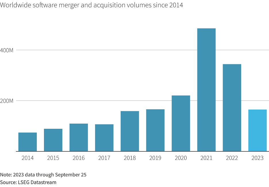 The positive outlook for software mergers and acquisitions is a welcome relief for dealmakers, given the 61% decline in technology sector activity, totaling $231.5 billion year-to-date in the first eight months of 2023, according to LSEG data.