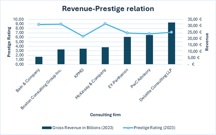The prestige ranking used in the graph above is based on surveys made by Vault conducted among consultants from various firms and regions. They were asked to rate each consulting firm on a scale of 1 to 10, excluding their own firm, and focusing only on those they were familiar with.