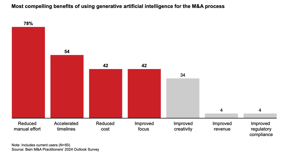 The benefits derived from employing generative AI in M&A are substantial, as reported by 78% of surveyed individuals who experienced productivity gains through reduced manual efforts. Additionally, 54% witnessed accelerated timelines, while 42% reported reduced costs and enhanced focus. Impressively, 85% of early adopters attest that generative AI either met or surpassed their expectations.