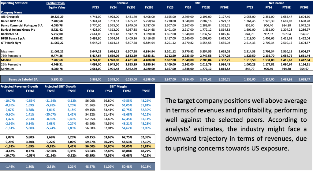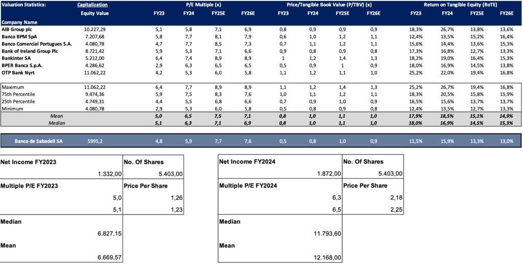 We deliberately excluded institutions like Mediobanca and FinecoBank, despite having similar market capitalizations. Mediobanca operates primarily in investment banking and wealth management, which makes its earnings and capital structure less comparable to Sabadell’s traditional banking model. FinecoBank was also excluded due to its fintech-driven business model and reliance on fee-based income, making its valuation multiples less representative for a traditional retail and commercial bank like Sabadell. Other excluded companies were Poste Italiane, which combines logistic and insurance with banking, and Nexi, which operates in the digital payments space. The valuation relies primarily on the FY2023 figures, going back to the time of the original valuation. Moreover, we considered FY2024 consolidated results and expected 2025 and 2026 figures.