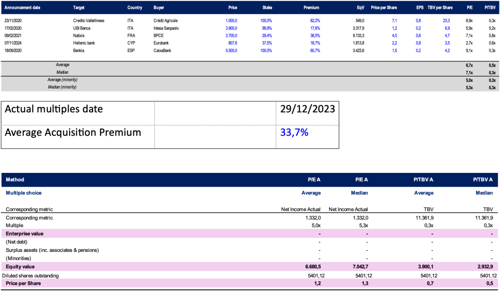 Regarding the Deal Multiples method, we did deliberately not consider the Bankia-CaixaBank deal, considering it an outlier. The proposed Price per Share derived from the Deal Multiples is in a range of €0,65 – €1,74, being the precedent transactions more diversified.