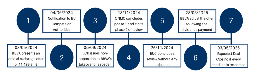 To complete the acquisition, the offer must be accepted by the majority of Sabadell’s shareholders and approved by the relevant regulatory authorities. Between June 4th and June 19th 2024, the deal was notified to various competition authorities, including the European Central Bank (ECB). The response from international regulators was mostly positive: the French, Portuguese, and Mexican competition authorities, along with the ECB, approved the transaction without requiring further inquiry. However, the process at the national level was less straightforward. On November 7th, the Spanish National Commission on Markets and Competition (CNMC) announced that the transaction would require a Phase 2 review, delaying the potential closing of the deal. In an effort to gain approval from the Spanish authority, BBVA submitted a set of commitments on November 21st. These included promises not to close branches in areas without nearby alternatives, to maintain current commercial terms for individuals and SMEs in regions with fewer than four financial institutions, and to preserve SME credit lines and total loan volumes for companies that work exclusively with BBVA and Sabadell for at least 18 months.