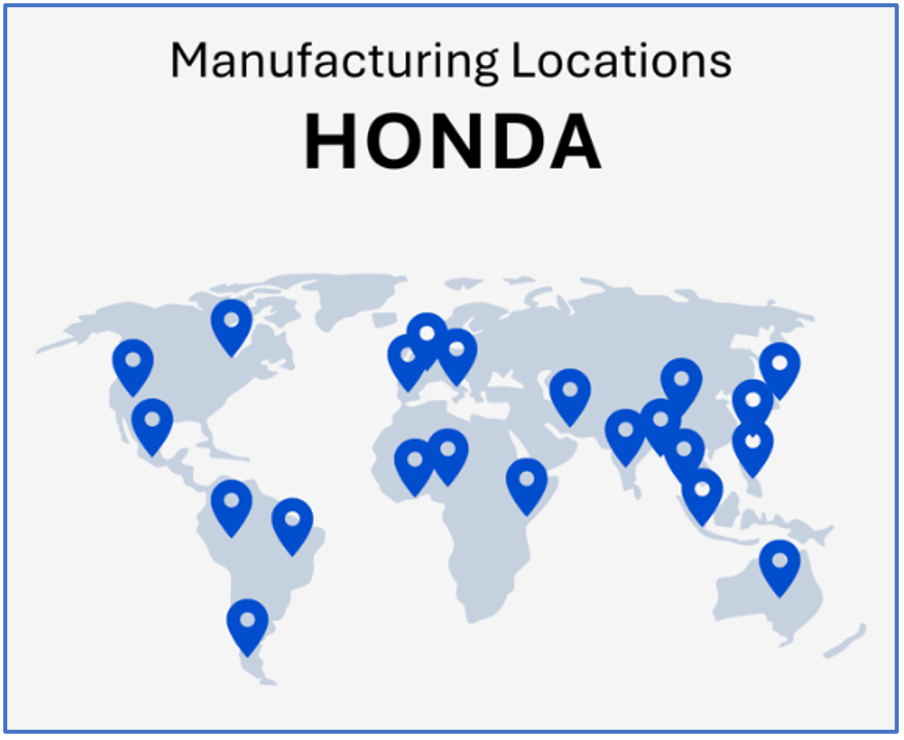 Honda’s supply chain and manufacturing operations are highly decentralized, providing the flexibility to adapt quickly to local market conditions. With major production facilities in Europe, the U.S., China, and Japan—alongside smaller facilities in Africa, Asia, South America, and Indonesia—Honda effectively minimizes transportation costs and avoids tariffs while maintaining a strong presence and responding rapidly to the preferences of key markets. This strategic approach also allows the company to remain agile in its operations.