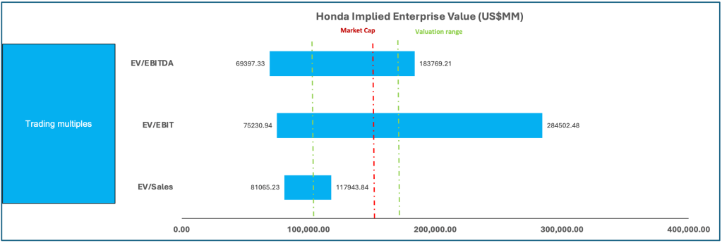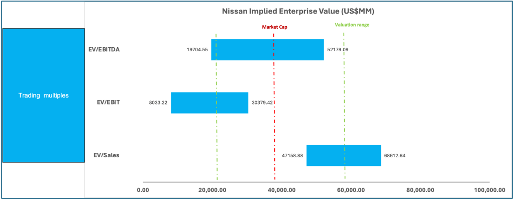 We estimate the median multiples on EV/Sales as 0.62x, on EV/EBIT as 9.60x, and on EV/EBITDA as 7.26x. These findings yield valuation ranges for Nissan and Honda’s enterprise value, which we summarize in the following football fields.