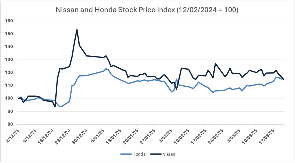 The first news about the merger came out on December 17th, 2024. The Financial Times and several other newspapers, including the Nikkei Asia, reported that the two companies were holding exploratory talks. The market’s immediate reaction was reflected primarily in Nissan’s stock performance: It experienced an impressive +23% day-to-day price increase and climbed more than 6% the next day. On the contrary, Honda’s investors didn’t take it particularly well, as the company shed 3% in value.