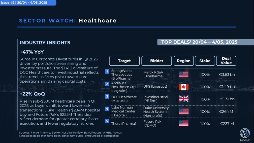 This issue of M&A Pulse analyses key dealmaking activity across FIG, TMT, Healthcare, and Industrials, with a focus on complex transaction structures and shifting capital allocation. The period is marked by KKR’s acquisition of OSTTRA, TPG’s strategic entry into hospitality tech, and UPS’s vertical integration in healthcare logistics.