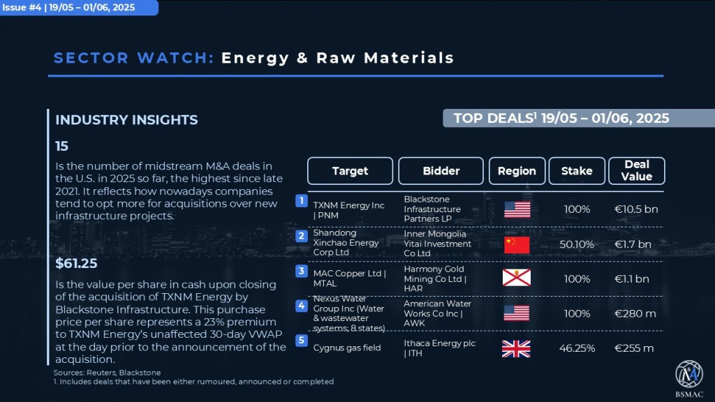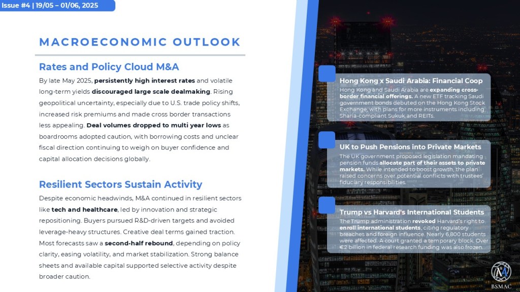 The fourth edition of M&A Pulse covers a diverse set of strategic transactions across core verticals. In FIG, we track FSI and Bain Capital’s asset repositioning and continued consolidation in European financial services. The TMT space remains highly active, with AT&T’s €5.1bn acquisition of Lumen FTH business and Motorola’s move on Silvus Technologies indicating strong infrastructure appetite.