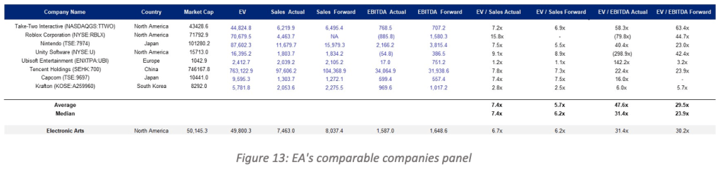 Given EA’s diversified revenue base, the comparable companies used in the analysis focus on global gaming publishers and interactive entertainment firms.