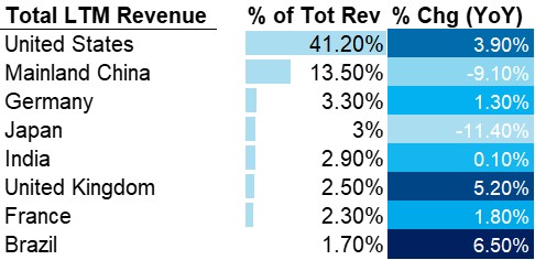 EA’s total LTM revenue stands at 6.1bn €, with the United States contributing 41% of total revenue, followed by China (3.9%), Germany (3.3%), Japan (3.0%), and the United Kingdom (2.5%). Here are represented the most relevant geographies, associated with percentages of EA revenues: