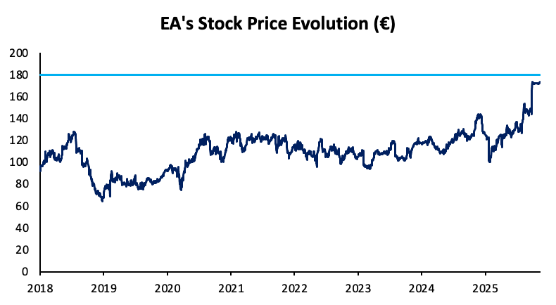 Despite the size of debt raised (€17bn), which is expected to lead to an increase in annual interest expense of about €1bn (accounting for about 70% of EBITDA), from 2027 until the end of the forecast period, current EA’s profitability (constant around 20% EBIT margin) and cash flow generation capacity (€1bn of FCFE in 2025) should allow the acquired company to service its debt and keep its DSCR in a range between 3.3x and 3.9x from 2027 (the year the increase in interest expense kicks in) to 2030 (end of the forecast period).