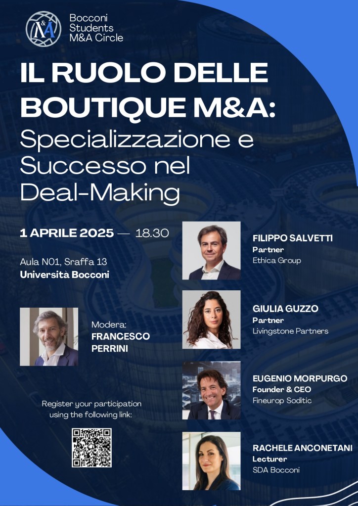 Cinque voci autorevoli del settore condivideranno il loro punto di vista in data 1 aprile 2025 presso l’Università Bocconi: Professor Francesco Perrini (ClearWater International Italy), Filippo Salvetti (Ethica Group), Giulia Guzzo (Livingstone Partners), Eugenio Morpurgo (Fineurop Soditic), and Rachele Anconetani (SDA Bocconi).